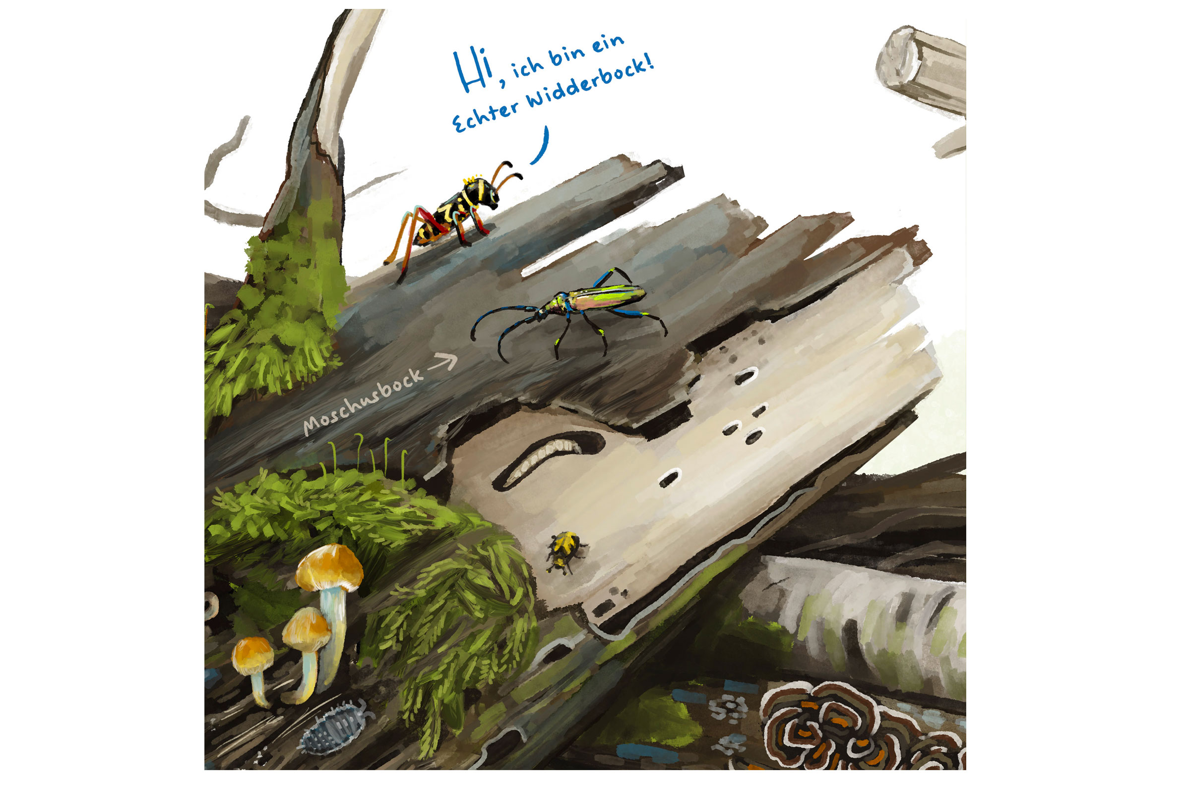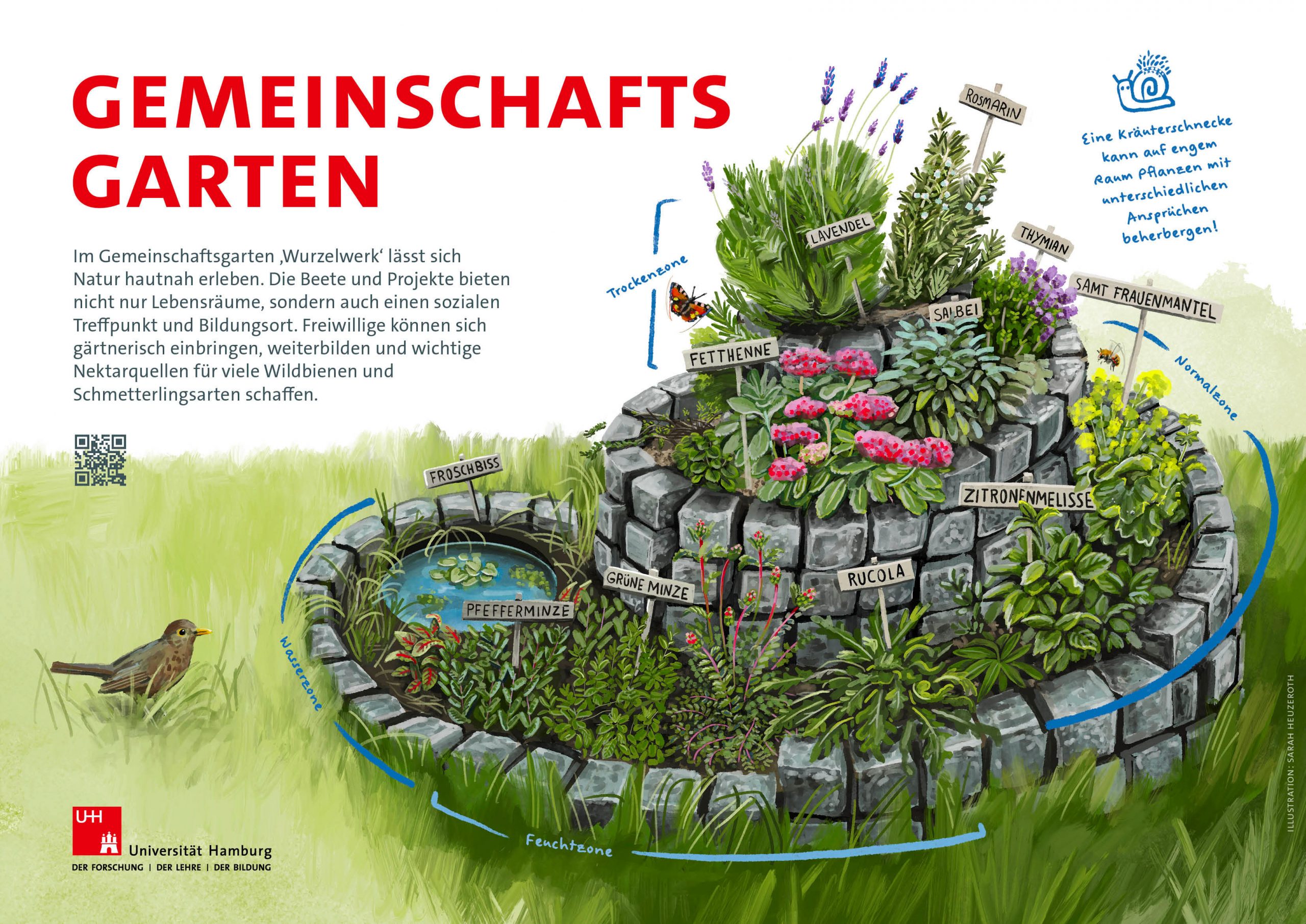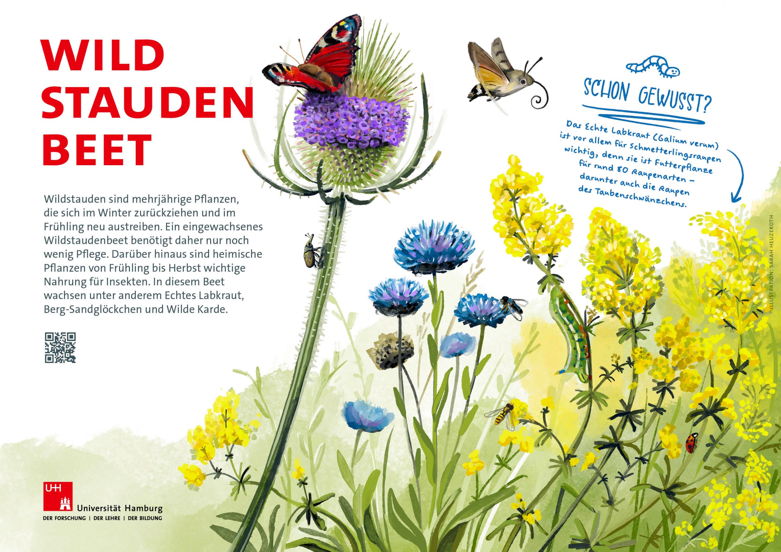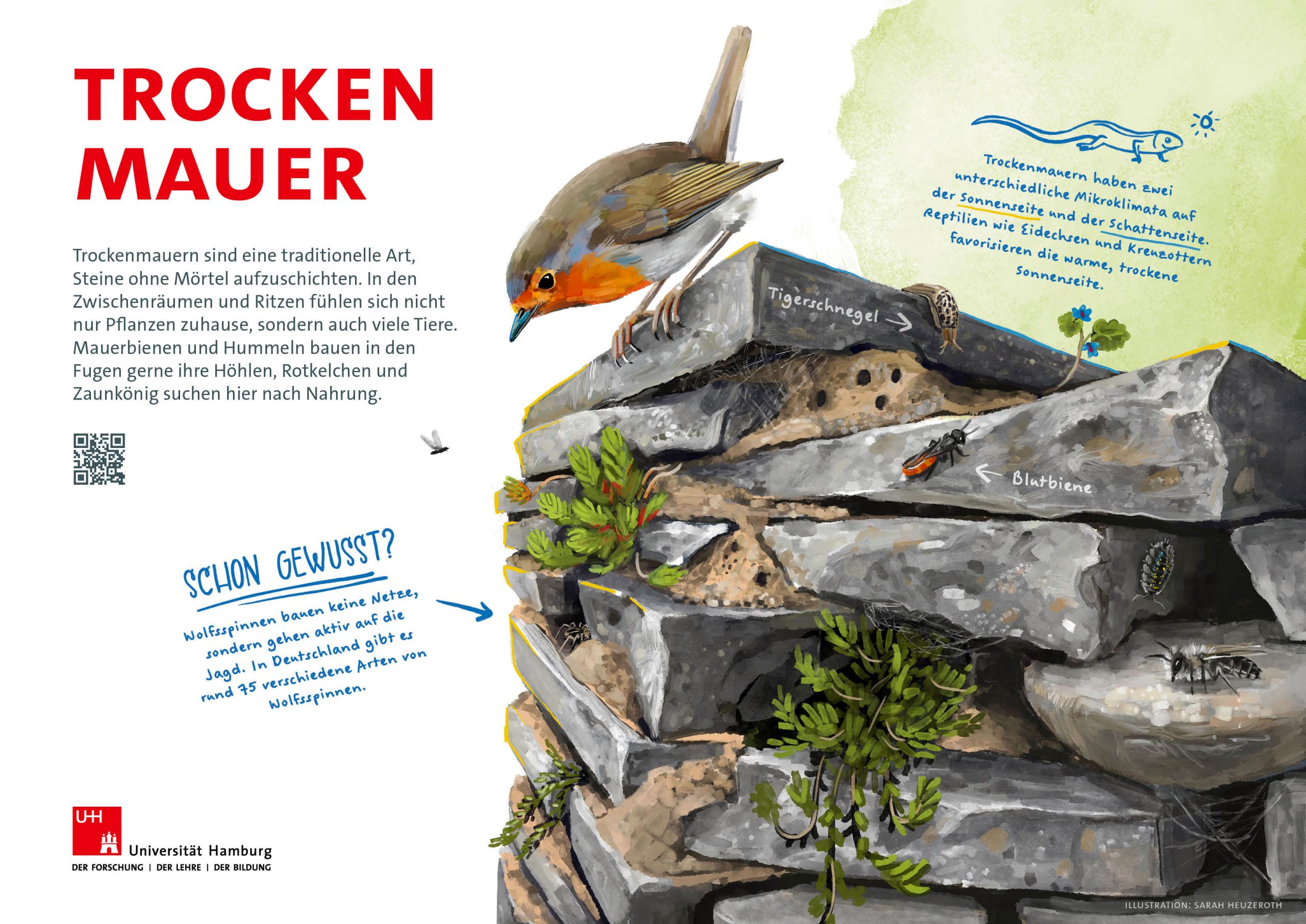 Für einen neuen Biodiversitätslehrpfad, der im Frühjahr 2026 auf dem Campus der Uni Hamburg eröffnet wird, habe ich zehn Lehrtafeln zu einzelnen Themen und Bereichen des Campus erstellt. Sie informieren über die mehr-als-menschlichen Mitbewohner des Unicampus, über wichtige Strukturen für die Artenvielfalt und fördern das Bewusstsein und Interesse für andere Tierarten und ihre Lebensräume.
