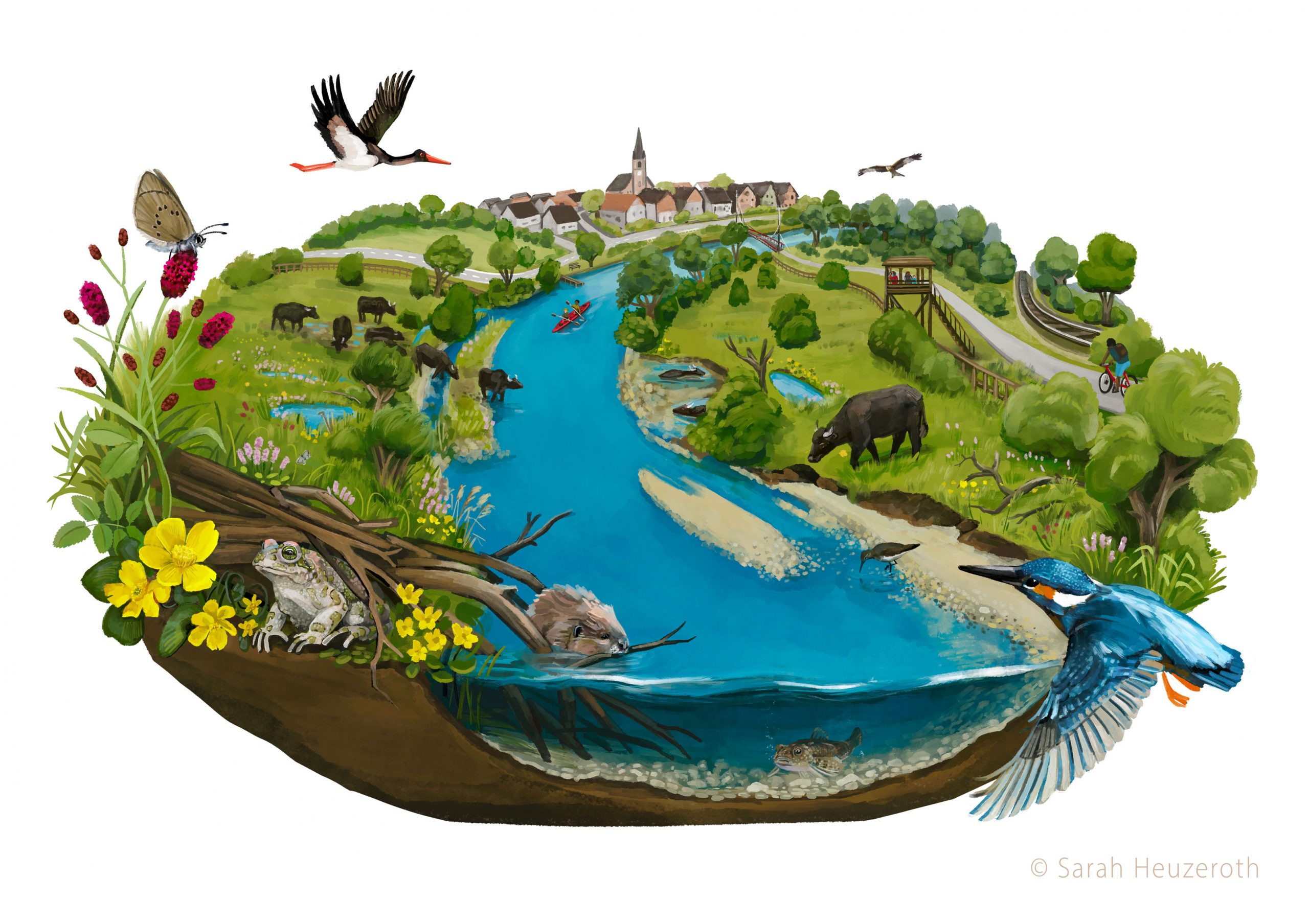 Für die NATURA 2000-STATION Obere Saale durfte ich die Saale zwischen Kaulsdorf und Breternitz als wilde und strukturreiche Auenlandschaft illustrieren – eine kleine Vorschau auf das, was im künftig in dieser Region entstehen soll. Ich freue mich sehr über die tolle Zusammenarbeit und die Gelegenheit, erneut ein so schönes Projekt illustrativ begleiten zu dürfen. Denn ich bin überzeugt: Wir brauchen eine Vorstellung davon, wie die Zukunft aussehen kann, um sich dafür einzusetzen.